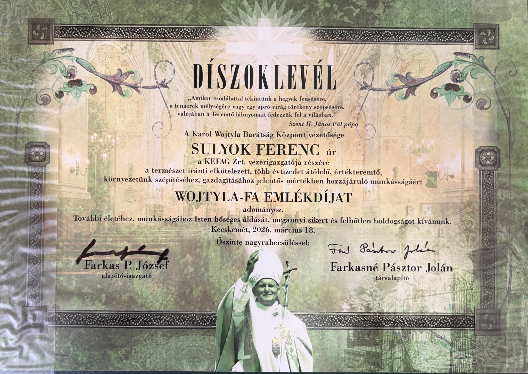 Az esemény végén a Wojtyla Barátság Központ elismerésben részesítette Sulyok Ferenc vezérigazgató urat, aki átvette a Wojtyla-fa emlékdíjat, amely a társaság több évtizedes, értékteremtő munkáját ismeri el. A kitüntetés annak a természet iránti elkötelezettségnek és környezetépítő tevékenységnek szól, amellyel a KEFAG Zrt. Kecskemét és térsége természeti értékeinek gyarapításához, valamint a közösségi terek szépítéséhez is hozzájárul.